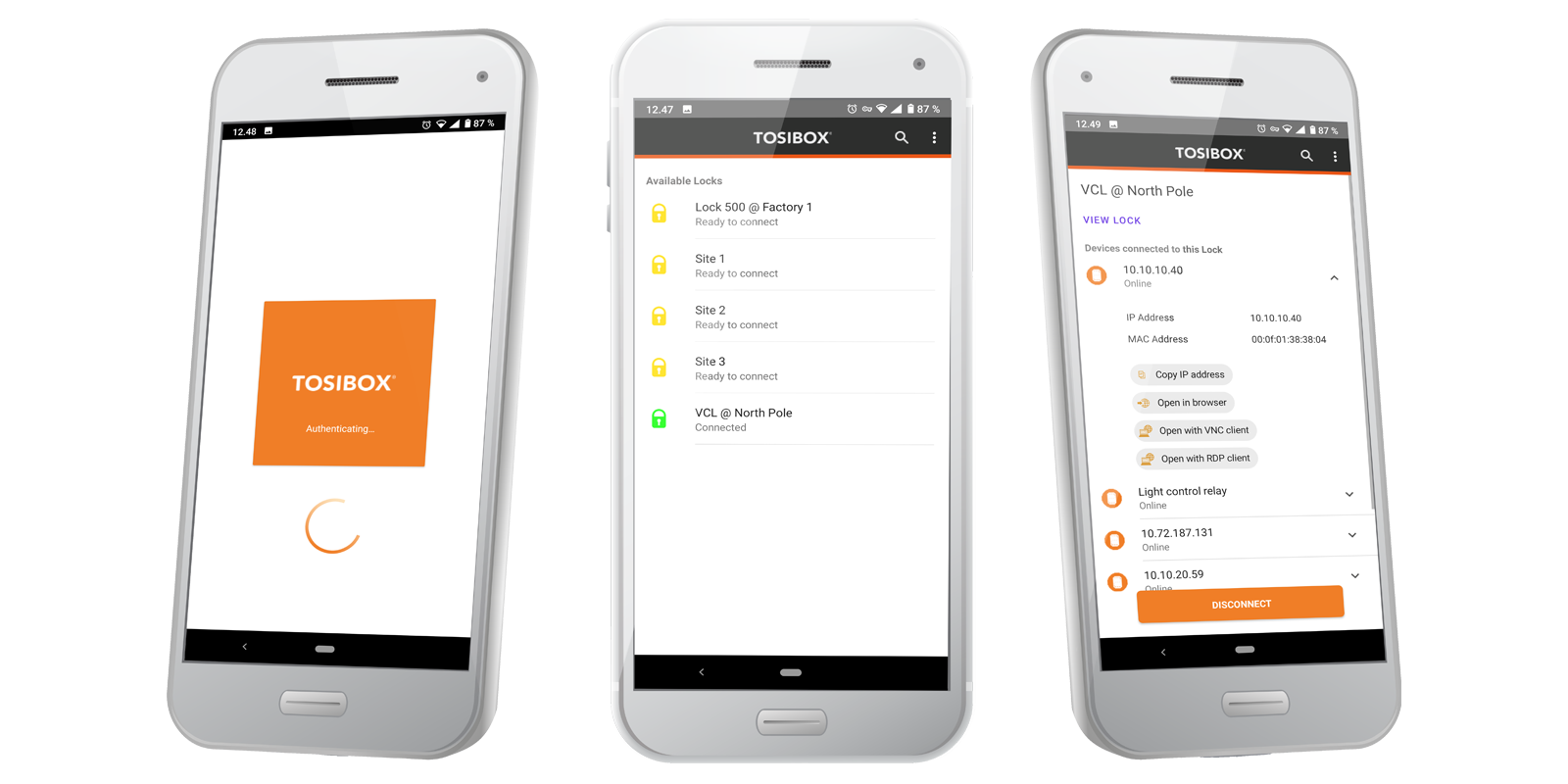 TOSIBOX® Mobile Client TOSIBOX® Mobile Client 擴展了當前的 TOSIBOX® 解決方案,讓您隨時隨地進行安全、輕鬆的遠端存取。 這個應用程序適用於 iPhone、iPad 和 Android 裝置。 TOSIBOX® MOBILE CLIENT 特點 用行動裝置的 Wi-Fi 或行動數據上網,開啟安全VPN連線到TOSIBOX® Lock裝置。請參閱安全中心Q&A。只需幾分鐘即可輕鬆上手。 可以透過掃描二維條碼(QR code)來完成初始配對。建立在 TOSIBOX® 產品的實體安全基礎之上:存取權限由實體TOSIBOX® Key授權和控制,Mobile Client就會被綁定在Key上面。 存取權限是被指定於特定的裝置,且不可轉讓權限。 並使用雙因素(2-factor)身份驗證方案。不限制應用程式的用法:大多數支援網路的應用程式,都能透過TOSIBOX®遠端連線工作。 MOBILE CLIENT 技術資料 Android version 4.0 or greater / iOS version 8.0 or greaterAuthentication based on PKI standards, 2048 bit RSA keysData encryption: TLS, Blowfish-128-CBC, AES-128-CBC, AES-256-CBCLayer 3 VPN connection (OpenVPN on Android, IPsec/IKEv2 on iOS) Encrypted tunnel, end-to-end authenticatedMulti-factor authenticationDoes not interfere with the use of other network-enabled applications 免費下載 MOBILE CLIENT